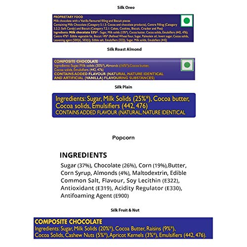 This combo also contains one Dairy Milk Silk Oreo, 60g, One Dairy Milk Silk plain 60g, One Dairy Milk silk roast almond 58g, One Dairy Milk Silk Fruit &Nut, 55g