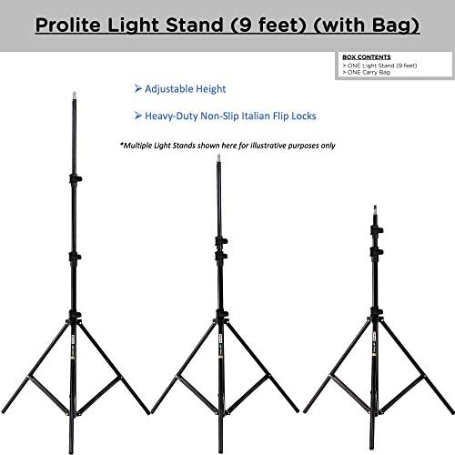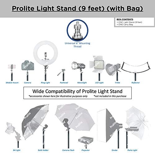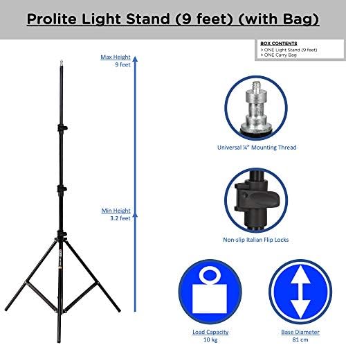 Perfect light stand for studio and on-site use Universal mounting threads designed to fit Ring Lights, monolights/strobes, continuous lights, and accessories Folded height of 3.2ft / 38.4inch / 97.5cm Maximum height of 9ft / 108inch / 274.3cm, with foot covering circle of diameter 81.2cm Foldable, Portable stand with non-padded carry bag weighs 2.6kg, easy to transport FEATURES: Non-slip Italian Flip locks Unbreakable metal adapter at the bottom Spring cushioning mechanism prevents physical injury and provides safety to mounted lighting accessories