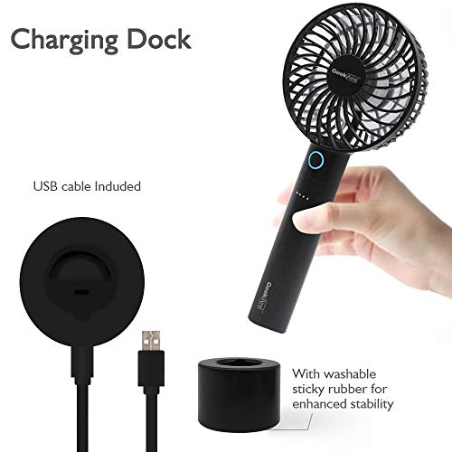 ACCESSORIES: Comes with a charging dock for convenient charging and desktop use, the charging dock has a washable sticky rubber for enhanced stability. USB cable, hand strap are also included in the box. Worry-free safety: 5V low voltage. Please charge the Fan for 3 hours before initial use.