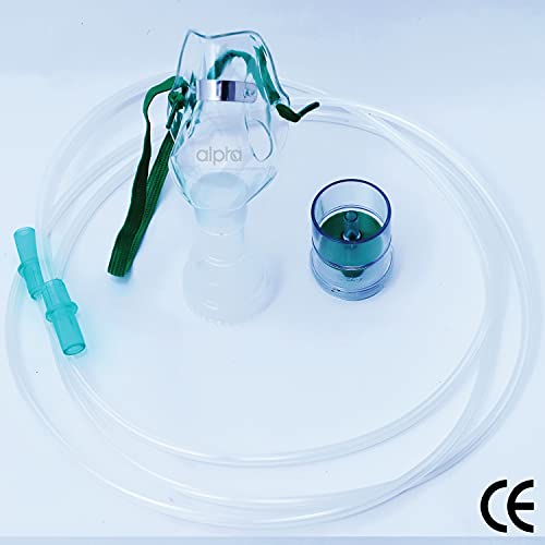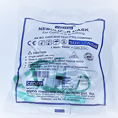 alpha Nebulizer Mask (adult) – comfort in breathing is perfectly fit with most of the Nebulizer Machines available in the market. It comprises of three things – a mask, tube and medicine cup. A mask with a string attached makes it easy to wear on your face and inhale perfectly. A medicine cup incuded comes with embossed marking showing level of medicine – 6cc, 4cc and 2cc. The mask and tube is made up of good quality PVC, non toxic and not sterile. A tube with sufficient length of 1 Meter which makes it ideal to carry around while using it with Nebulizer Machine. It comes with a standard size pipe, easy to attach with majority of nebulizer machines available around the market. alpha nebulizer adult mask kit/set is ideal to use in-house/outdoor/hospitals or wherever a nebulizer machine is accessible. After use, you can clean it with lukewarm water It’s advisable to use for single patient only.