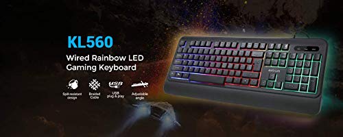 Astrum KL560 Rainbow Color Back-lit LED Wired Keyboard. Elegant multi-color light emitting keyboard built for core PC gaming and normal desktop use, includes 19 anti-ghosting keys and liquid silicone for pleasant keystrokes.