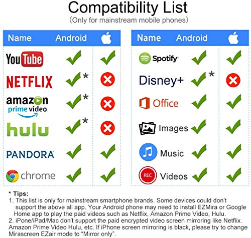 Supports Screen Share: Airplay, Miracast, DLNA (DLNA: Standard), Chromecast only for Android Phone APP with Android 4,4 above, Note: Android device support Chromecast / Google Home / Netflix….IOS can not support Chromecast / Google Home / Netflix.