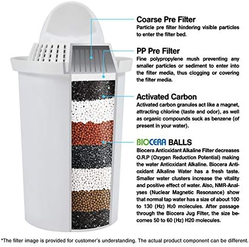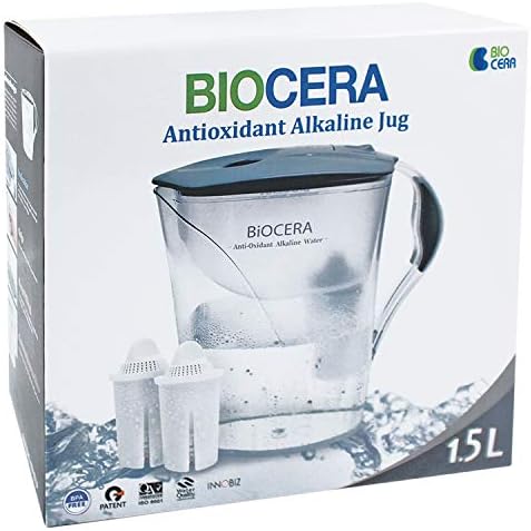 The alkaline jug filter is now the most effective way for people to enjoy the benefits of filtered alkaline water.Better body hydration! Product Information: Drinking alkaline water is the simplest thing that everyone can do to improve their health,increasing energy levels,enhancing immunity and slowing down the ageing process.The alkaline antioxidant jug filter turns tap water into mineral rich health promoting water which is alkaline in pH with antioxidant properties.It uses a new generation of special natural ceramic balls,alkaline balls and about 10 kinds of minerals and far infrared rays reducing toxic heavy metals.The jug filter helps to increase the ph of typically between 8.5 and 9.5,putting beneficial minerals into the water and reducing the size of water molecules so the water is more easily absorbed.The jug filter also reduces toxic metals such as lead and copper along with chlorine and pesticides.The jug capacity is 1.8L of filtered water and each filter lasts for approx 150L. Instructions for setting up and use: 1.Remove filter from package and place in a tub of water or in the base of the jug, cover with water and soak for 15 minutes. 2.Place filter cartridge in position in the jug. 3.Pour up to 2 litres of water through the filter and discard this water (the water may be cloudy at first,this is just dust from the filter media and is harmless).The filter jug is then ready for use. 4.It is best to keep sufficient water in the jug so that the best of the filter cartridge is in the filtered water. 5.Set the gauge on the top of the jug as a reminder to replace the filter cartridge every 8 weeks. 6.The jug should periodically be cleaned with mild soapy water.Please ensure that the filter is removed prior to cleaning. 7.When testing the pH of the filtered water you should either use an electronic tester or pH reagent drops. pH papers or pH sticks used for the testing of saliva or urine are not suitable and give very inaccurate results.