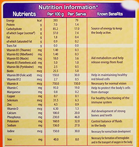 It contains Protein (which helps in maintenance and growth of muscle mass), Vitamin B12/B2 (which is essential for maintaining a normal function of the nervous system) and Iodine/Iron (which support normal cognitive functions.