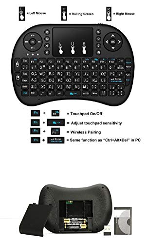 Buddymate New and Innovative design Wireless Mini Keyboard with Mouse keys on top for easy handling and Backlight Quickview This is a wonderful combo, 2.4GHz Mini Wireless QWERTY keyboard, TouchPad combo, New increased Backlit LED with Micro USB interface adapter for the lecturer, manager, presenter and others, from within a 15′ radius make a presentation and operate PC wirelessly. Change slides and screen options, write on the screen, emphasize words and objects just by using this wireless mini keyboard and mouse with touchpad. Perfect for PC, Pad, Andriod TV Box, Google TV Box73 keys, 2.4GHz wireless Keyboard with Touchpad. Touchpad DPI adjustable functions. Built-in high sensitive multi- touchpad. Mini QWERTY keyboard with multimedia control keys and PC gaming keys. Auto sleep and wake mode. The Ergonomically handheld design is easy to carry and operate. Backlight function Build-in rechargeable Li-ion battery that has longer standby time. Specifications Operating range: 15 meters(MAX), without signal disturbance and no direction limit. Operational voltage: 3.7V. -Charge Voltage: 4.4V ~ 5.25V. Modulation: GFSK. Layout: US-TX Power: less than +4dBm. Frequency tolerance: + -30ppm. Power consumption: 55mA(on), 1mA(sleep). Battery Type: Built-in lithium-ion battery Notice: After 3 minutes without any operating will into sleep mode, press any key about 1s to wake up Package 1 x Wireless keyboard. 1 x Wireless receiver. 1 x Charging cable. 1 x User manual.