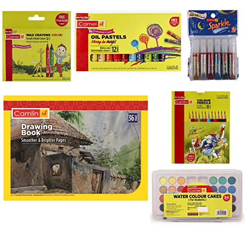Everything your child will need to begin painting. Camlin presents a range of good quality, non-toxic water colours in cake form with excellent colouring strength developed specially for students. Item includes: Box of Water Colour Cake – 24 shades, Drawing Book – 1 quantity, Sketch pen (12 Shades), 4 Brushes .