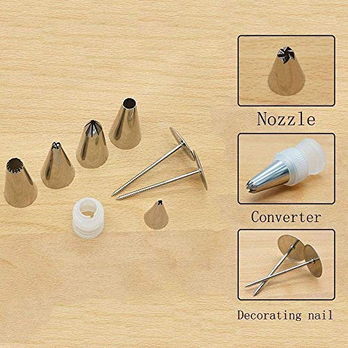 Dimension: Big Nozzle- (2.5*2.5*4.5)cm Small Nozzle -(1.8*1.8*3.2) cm, / Including 48 tips + 4 larger tips + 2 flower nails + 1 standard couple.