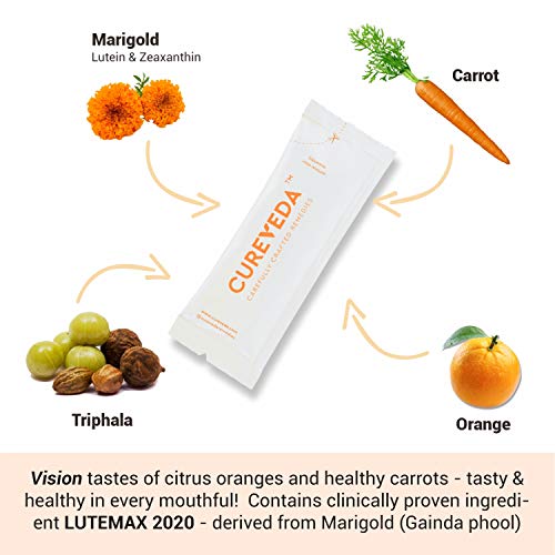 1 sachet daily for adults & children OR 2 sachets daily for adults with over 4 hours of screen time or as advised by the physician. Consume any time of day.Handpicked phyto-extracts, herbs & fruits are amalgamated to create a unique dosage format with high efficacy. Cureveda Vision is carefully crafted to make your herbal blends enjoyable and convenient to consume. Look forward to a delicious mouthful everyday