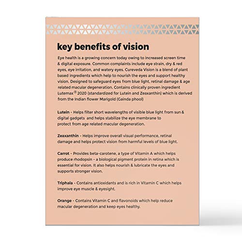 Contains clinically proven ingredient Lutemax 2020 (standardized for Lutein and Zeaxanthin) which is derived from the Indian flower Marigold or gainda phool. Lutein – Helps filter short wavelengths of visible blue light from sun & digital gadgets and helps stabilize the eye membrane to protect from age related macular degeneration. Zeaxanthin – Helps improve overall visual performance, retinal damage and helps protect vision from harmful levels of blue light.