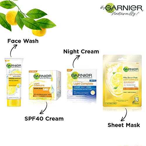 Garnier Light Complete Serum Cream with SPF40 / PA+++ is a moisturising cream that gives you spot-less, bright skin in just 1 week. The SPF40 in the serum cream protects your skin from the damage caused by harsh sun rays such as skin tanning, spots, and sunburns. Enriched with fresh Yuzu Lemon and 3X Vitamin C, its ultra-light formula absorbs quickly into the skin keeping it bright and spot-less, even in the sun. To use – Spread evenly on freshly cleansed face and neck, avoiding the delicate eye area. For best results, use as follows – in the day time, use Garnier Light Complete Face wash to cleanse, followed by the Garnier Light Complete Vitamin C Booster Serum and Garnier Light Complete Serum Cream with SPF 40/ PA+++ to brighen, moisturize and protect. Bonus step (after Step 1) – Garnier Light Complete Serum Sheet Mask – To intensely hydrate your skin and get a facial-like glow at home. At night, repeat the above steps while replacing the Garnier Light Complete Serum Cream with SPF 40/ PA+++ with Garnier Light Complete Yoghurt Night Cream.