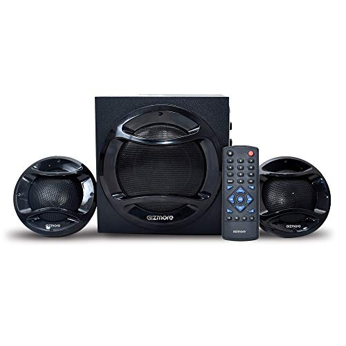The Hot New Gizmore GIZ Trio 2111 Multimedia Speaker is a MADE IN INDIA 2.1 speaker with a splendid design and powerful sound. 2.1 Shelf System with Sound Digital with Bluetooth, USB, and AUX FM Radio & Micro SD Card Input offer you and your home an elevated audio experience. With strong, clear and vibrant sound quality this wired shelf system will bring a smile to your face while filling your home or office with the sounds of your favourite tracks. Lighting element adds a subtle allure that enhances your visual and audible experience. Alternating light patterns will move along with the sounds of the music to delight your senses and add a special touch to the songs you know and love. As well as 2 additional wired shelf speakers which may be angled to convey the sound to each corner of your musical enjoyment space of choice. Delivers super sound with a 4″ woofer driver and four 4″ Satellite drivers, all housed in a wooden cabinet to enhance your listening experience