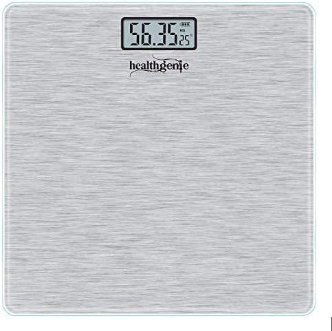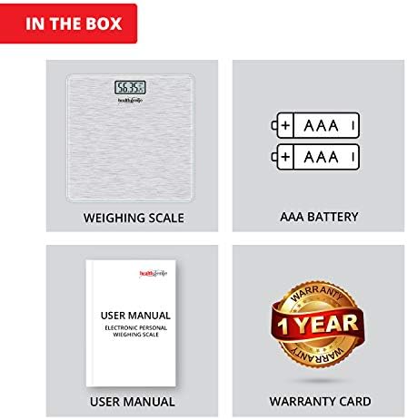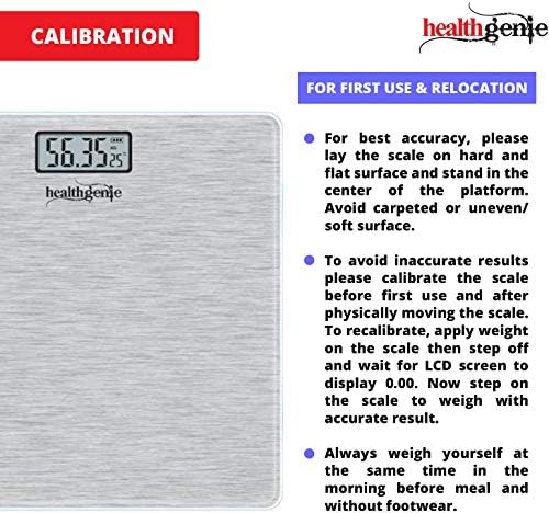 Healthgenie Electronic Digital Weighing Scale for Body weight,Bathroom weighing scale – (Brushed Metallic) can be used as digital bathroom scales. The design is brushed black having anti-skid platform on jet toughened glass surface with curved edges for added safety.Reliable features of Healthgenie Weighing Scales are Large LCD display shows weight, room temperature and battery status,error, Low Battery indicator.5kg-180kg weight is the weight range,3 measuring units kg/lb./st (Press button at bottom to switch), Step-ON Technology, Error, Low Battery indicators & Auto Off are the some best features which makes it best scale.It have 2*AAA lithium polymer battery for greater life so no worry to charge it again.To calibrate the weighing scale place the weighing scale on hard, flat surface and initialize by pressing one foot on the platform until random numbers appear on screen,remove foot as it returns to zero (0.0),Now weight yourself.The best time to measure body weight is morning as weight tends to fluctuate throughout the day as per food and liquid intake.Weight variations : It is suggested to always ignore the first reading for calibration every time for best accuracy.