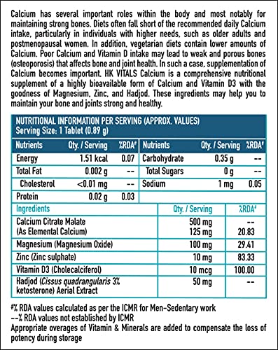 HIGHLY ABSORBABLE CALCIUM: Calcium Citrate Malate (CCM) in HK Vitals Calcium is an easily absorbable and highly bioavailable form of Calcium. Vitamin D helps the body absorb Calcium better and reduces the rate of loss of bone density (osteoporosis).