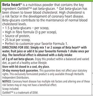 Beta Heart powder contains oat beta glucan as a key ingredient which is a natural form of soluble fiber found mostly in the outer layer of oat grains. One serving provides 3 grams of oat beta glucan. It is a good source of dietary fiber with no added sugar or artificial sweeteners or colors