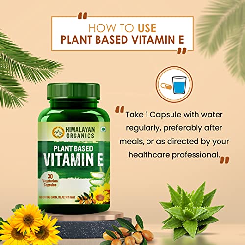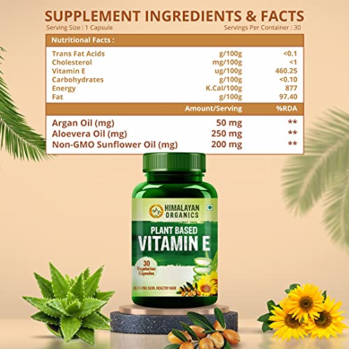 Himalayan Organics Plant-based Vitamin E Capsule is a fat-soluble antioxidant and essential nutrient for healthy skin, hair, and nail health. These organic capsules are enriched with botanics like argan oil, aloe vera, and sunflower oil to aid in fighting cell-damaging free radicals that cause oxidative stress in the body