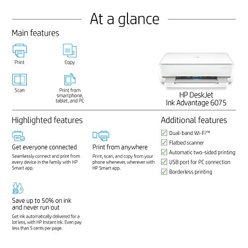Compatible OS: Windows 10.7; MacOS Sierra v10.12 (previously OS X), macOS High Sierra v10.13, macOS Mojave v10.14, macOS Catalina v10.15 , Ideal usage: Home, Included components: HP DeskJet Plus Ink Advantage 6075 All-in-One Printer; Setup Black & Tri-colour Cartridges; Regulatory flyer; Setup guide; Reference guide; Power cord , Resolution: Up to 1200 x 1200 dpi , Duty cycle: up to 1000 pages ; HP Customer Care Contact No: 18002587170