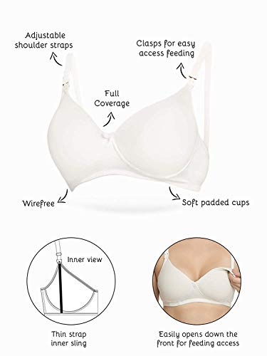 This Inner Sense white nursing bra is padded, nonwired and seamless for no nippleshow through. It is apt to wear under tshirts. Breastfeeding access via clasps that can be pulled down.