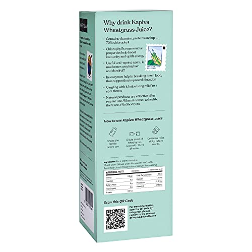 Wheatgrass is the young grass of the wheat plant and is considered a superfood due to its abundance of health and wellness benefits. It contains iron, magnesium, chlorophyll, enzymes, calcium and many other nutrients. Kapiva maximizes the benefits of Wheatgrass by using the grass in its purest form, cutting it 8 days after irrigation when the chlorophyll content is maximum and adding no artificial flavour or colour. We use only natural products, which is why the colour of the juice varies seasonally.