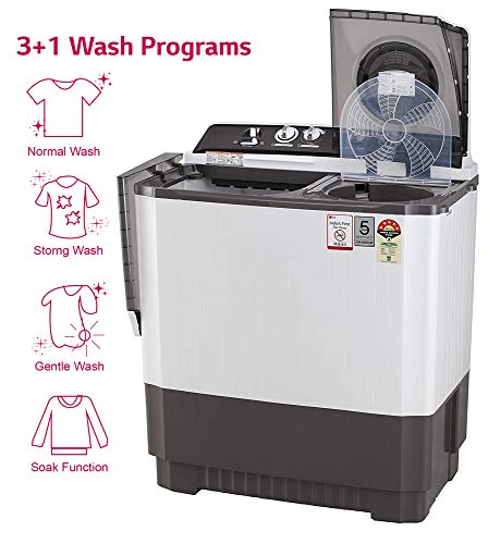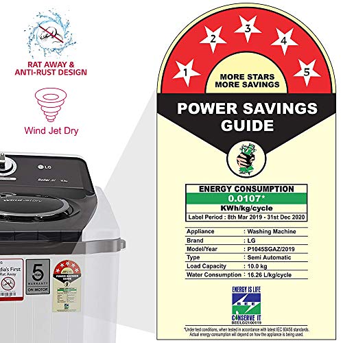 LG P1045SGAZ Semiautomatic washing machines equipped with roller jet pulsator rotates the clothes effectively & Washes out every stain from the clothes for best wash performance. Now choose between 4 wash programs –Gentle, Normal, strong & soak depending on you fabric type. Faster Drying of clothes with LG air dry helps you save time & effort. Wind Jet Dry Reduces remaining moisture on laundry and inside of washing machine by Spin tub rotating at high RPM, air comes into the tub and is circulated inside which removes water. Circulation of air through air vents dries clothes. Also have “Punch+3” features one main pulsator and three mini pulsators around. The punch action creats three powerful streams of water which move repeatedly the laundry up and down in the drum ensuring that the tough soil is removed from your laundry. This unique structure of pulsator brings optimal washing action to your washer.Auto Restart function feature enables machine to re-start washing process from the same time after electric supply resumes from the Power cut.Rat Away technology keeps the rat away from damaging your machines. The soaking option allows your clothes to soak in a concentrated detergent solution to ensure that you win half the battle against dirt. The presence of the lint collector is essential because it ensures that the lint from your clothes does not clog the machine or the drains. The spin shower system washes off the soap residue to leave your clothes sparklingly clean. The collar scrubber makes your job easy. The air dryer ensures to dry your clothes by at least 40%. Rats do not dare to come near your device because of Rat Away Technology at work.