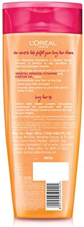 Dreaming of long hair but tired of long hair problems like hair breakage, damaged hair, and split ends? Save the last 3 cms of your hair and instantly transform your long hair with the new L’Oréal Paris Dream Lengths Restoring Shampoo – a shampoo for hair growth! Infused with Vegetal Keratin and Castor Oil, the creamy Dream Lengths Restoring Shampoo intensely repairs the lengths of your hair so you can achieve your long hair goals without the long hair problems – a great shampoo for split ends! With vitamin B3 and B5, this hair repair shampoo visibly repairs damaged hair without weighing your hair down, and leaves your hair feeling 2X stronger. For best results and reduced hair breakage, use the L’Oréal Paris shampoo with the new L’Oréal Paris Dream Lengths Detangling Conditioner and L’Oréal Paris Dream Lengths No Haircut Cream (Leave In Cream). How To use? Massage the shampoo gently into wet scalp and hair, working from roots to tips and lather. Rinse thoroughly until no residue is left behind.