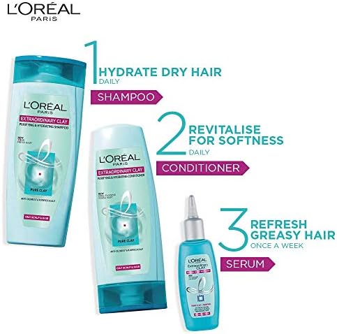 L’Oréal Paris laboratories have infused the extraordinary power of pure clay in a conditioner. Anti-oiliness. Fresh, healthy looking hair. Soft, free flowing hair. Ultra purifying washes off excess oil on scalp, roots, and helps eliminate impurities and pollution particles. Intensely hydrating moisturizes from lengths to tips for hydrated free flowing hair, leaving hair fresh for up to 72 hours. Enriched with extraordinary power of clay that deeply purifies and detangles your hair. Tailor made care to resolve the problems of oily roots and dry lengths. Hair feels pure, soft, and shiny and hydrated when used with the extraordinary clay shampoo. For best results, indulge in the full extraordinary clay ritual shampoo, conditioner and hair refresher.