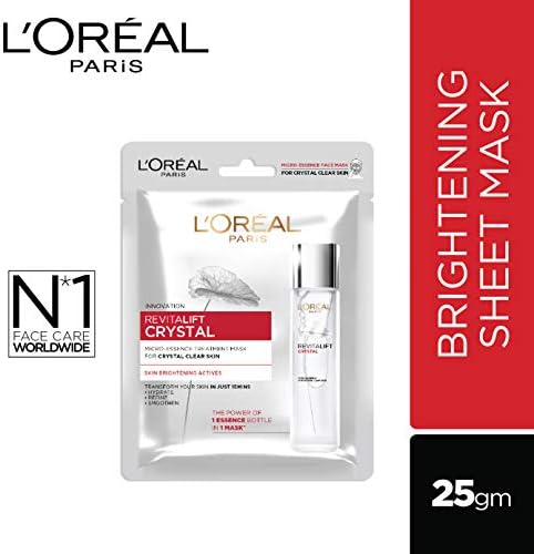 L’Oreal Paris revitalift crystal micro essence sheet mask contains essence that penetrates up to 10 layers* deep into the skin to give bright and crystal clear skin. Powered by an advanced patent cushion tissue mask technology, this sheet mask acts like a sponge for higher essence carrying capacity. It has up to 30x more absorption power* than the normal face mask, which leads to lesser dripping & helps deliver more essence onto the skin for quick results. This sheet mask has a very thin, light and breathable material that makes it better than the normal sheet mask. It makes skin hydrated, smooth, radiant and glowing. The face mask has brightening actives that helps accelerate skin renewal, refines texture and minimizes pores; revealing brighter, smoother and clearer skin. Suitable for all skin types: this sheet mask is suitable for oily, combination, dry, normal and even sensitive and acne prone skin. For best results, use it along with crystal micro-essence to get brighter and crystal clear skin. In the morning, apply 4 drops of crystal micro-essence all over the face and in the evening, apply 4 drops of crystal micro-essence followed by crystal sheet mask. Use the face mask thrice a week.
