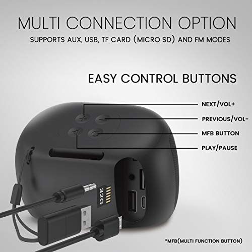 Get a surreal musical experience: Be immersed in your favourite tunes with the exceptional sound quality from the 45mm High Bass Driver in this portable wireless speaker together with 3.5mm Aux, USB, Micro SD Card, FM Support that provides access to any music of your choice