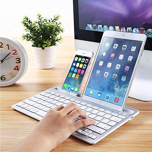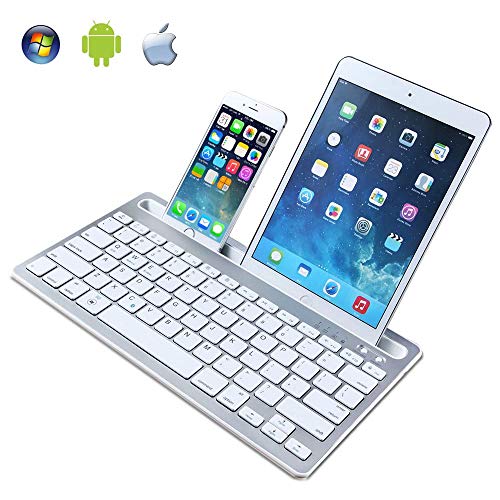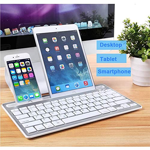 Finally—a desk keyboard for your computer that also works with your tablet and smartphone.this unique keyboard with integrated Smartphone/tablet cradle makes it a breeze to switch between typing on three different Bluetooth devices. One for all: Imagine typing a long blog on your computer when you get a text from a friend on your Smartphone. Now you can reply to your friend with the same comfortable, familiar typing experience you are used to—and go right back to typing your blog with the simple flick of a dial. Bluetooth enabled wireless devices which support external keyboards