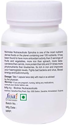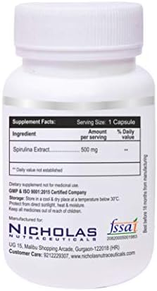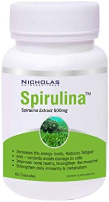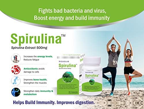 Nicholas Nutraceuticals Spirulina -500mg to Increase the energy levels, Reduces fatigue, Improves bone health, Anti-oxidants properties – 60 Capsules