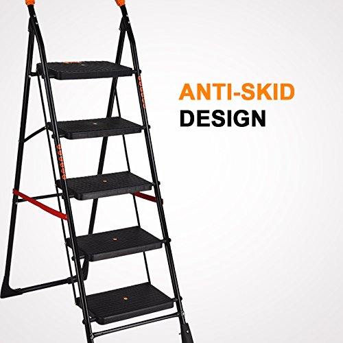Overview warehouse, godowns, libraries, etc require ladders for easy access to heights above the normal reaching position of a person. Paffy folding ladder with 5 wide steps is one such equipment suited for such places for easy access to the places that are normally out of reach. Heavy duty made from mild steel pipes and powder coated to a classic black colour, this strong mild steel ladder has heavy duty performance thanks to its ergonomic design and the quality material used in its manufacture. It has a cushioned top arch that allows a better grip for comfort and for safety. Anti-skid ladder keeping safety in mind, this anti-skid ladder has rubber boots that give a firm grip on the ground without sliding. Also, the polypropylene copolymer steps are 20×37 cm wide which gives good space for resting the feet while climbing and the top platform has a dimension of 25 x 37 cm. The safety clutch lock keeps the platform locked for safety. Foldable ladder ideal for office use, warehouses and other places, paffy folding ladder with 5 wide steps is corrosion free and has a long lasting life. So hurry and book your piece now.