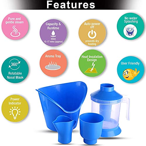 Vaporizer has 4 attachments all in One, Consisting of steamer, Vaporizer, Facial and Bottle Warmer. In steamer you can add inhalant for cold Relief and Congestion; the warm, moist steam relieves persistent cold and cough. Cord length is approx. 120 cm. Color: Multi-Color