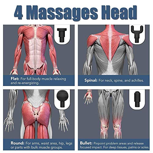 【6 Adjustable Speeds + 4 Replaceable Massage Heads】:The multi-frequency vibration design of the percussion massage gun, one-button start, 6 adjustable speeds to meet the needs of all muscle relaxation, 4 massage heads for different bodies Parts, you can adjust the intensity according to different parts of the body and different uses, and change the needs of the massage head