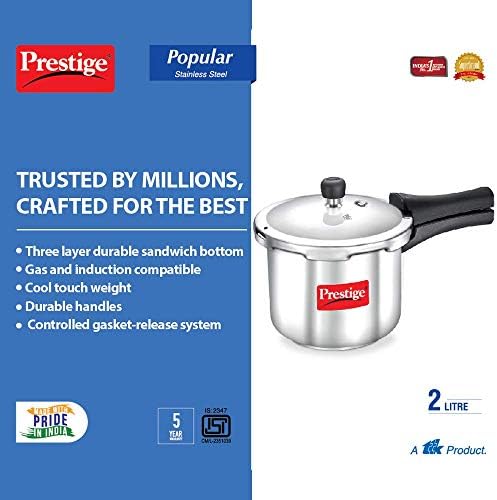 India’s favourite pressure cooker now with stainless steel body and induction base. The widely used and appreciated prestige popular pressure cooker comes with top of the line features. This cooker is made using best quality stainless steel which improves the durability of the cooker. The legacy carried by prestige pressure cookers is sure to make your cooking experience delightful.
