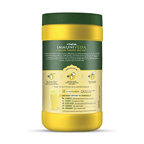 Saffola ImmuniVeda Golden Turmeric Milk Mix is an instant mix based on the time-tested immunity boosting recipe “Haldi-Doodh”. Each serve of this mix has the goodness of 2 spoons of Turmeric, which helps boost immunity and manage inflammation. This healthy drink is enriched with Cardamom, Cinnamon and Black Pepper – is tasty as well. Black Pepper aids in digestion and helps in absorption of turmeric in the body, so you can get all its benefits. Cinnamon helps support metabolism and cardamom is a source of anti-oxidants as well. Bites of real almond are a rich, natural source of protein and add a crunchy surprise to your turmeric milk. Mix this powder with milk or water and enjoy with any tasty recipe – hot turmeric latte, milk-shake, smoothie, a dessert or a daily glass of turmeric milk that your kids will love. Now give your family the enhanced goodness of turmeric, without them even knowing it! Why Saffola ImmuniVeda? Your immunity is your body’s shield against ailments. The need to bolster this natural protective cover is becoming critical as new challenges keep emerging in the world. Saffola ImmuniVeda is a contemporary range of products that harness the power of Ayurveda, with ingredients which help in boosting your immunity. Inspired by the ancient recipes, we have carefully selected potent ingredients and combined them to create unique Ayurvedic products.