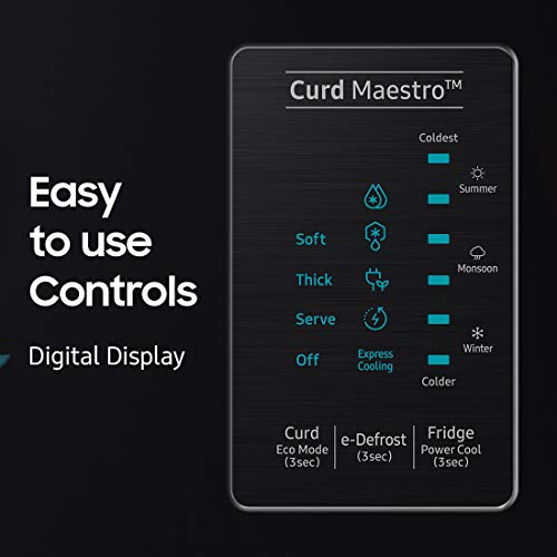 Spl. Features: Curd Maestro Now make perfect homemade curd, Digi-Touch Cool, Runs on home inverter, Stabilizer Free Operation (Voltage range 100V – 300V)