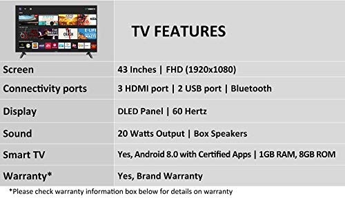 Smart Features : 1 GB RAM | 8 GB Internal Storage| Android 8.0 with Uniwall | A53 – Quad core Processor |OTA Updates| Free Live News Streaming | 1500000+ Hours of Content | 7000+ Free Movies in 16 different Languages and Multiple Genres | Content Discovery Engine| E-Share for iOS and Android – Screen Mirroring
