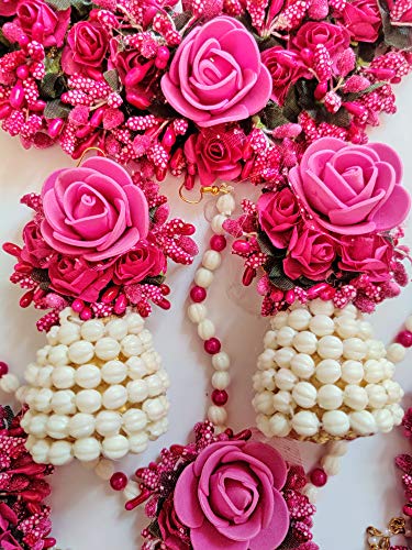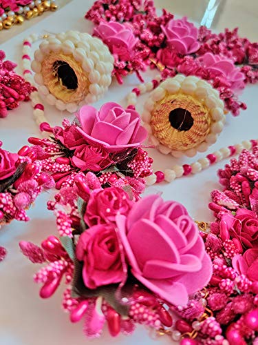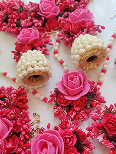 Soft Fabric Product contains : 1 Necklace, Pair Of Earrings,1 Maangtikka, Pair Of Hatful, Pair Of Payal : This flower set is most commonly used for haldi/mehendi/ functions Material : fabric Long Lasting product Extremely light weight and Comfy to wear Gives you a royal and fashionable look