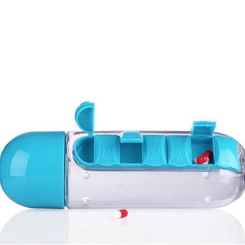 @ Water Bottle with Removable 7 Day Pill Organizer & Drinking Cup. How many times have you been out and have to take a pill and you have no water? The Water Bottle/Pill Organizer solves this. The Tritan Water Bottle has a removable 7 day pill dispenser attached on one side.