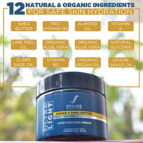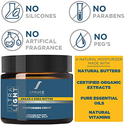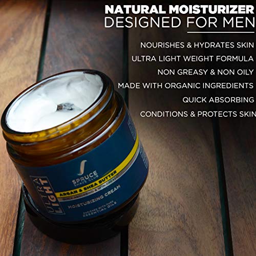 Our Ultra Light Moisturizing Face Cream for Men is a natural moisturizer for men that has been specially formulated with pure essential oils, certified organic natural extracts, natural butters & natural active ingredients to deliver a safer, more natural and premium daily moisturizing experience. The moisturizing face cream for men has been crafted to be designed to provide a quick absorbing, non-greasy & hydrating so it can provide an effective and quick moisturizing experience for all skin types. The face cream for men does not leave the skin feeling oily or greasy and absorbs within seconds while still providing long lasting hydration. High concentrations of fatty acids and vitamins make shea butter an ideal cosmetic ingredient for softening skin. Shea butter also has anti-inflammatory and healing properties that help condition tone and soothe your skin. Argan oil helps protect against sun damage, hydrate skin, reduce signs of aging, and even control oily skin. Moreover, a carefully crafted blend of natural extracts and essential oils like Lemongrass, Clary Sage, Organic Aloe Vera, Vitamin B3 & Pro Vitamin B5 work together to provide the most natural, hydrating, soothing and softening moisturizing experience.