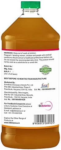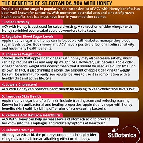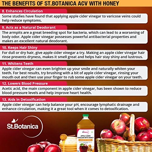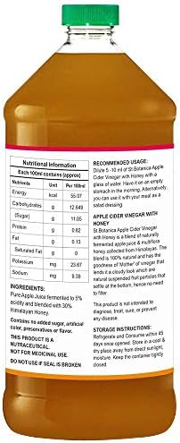 Naturally fermented with delicious Himalayan apples, St.Botanica apple cider vinegar with honey has the goodness of mother of vinegar, that lends it a cloudy look, but is an affirmation of high quality unprocessed vinegar. Loaded with potent antioxidants like vitamin C, vitamin E and vitamin A, B complex vitamins, bi flavonoids, acetic acid, enzymes and minerals Stbotanica apple cider vinegar is an elixir of life and the benefits are weight management several studies prove that apple cider vinegar and honey along with high carbohydrate meals can increase feeling of fullness that lowers your calorie intake and assists in weight management, probiotics the healthy bacteria in apple cider vinegar improve digestion and help in weight management, improves digestion dilute apple cider vinegar in water and have it at least thirty minutes prior to a heavy meal to stimulate digestive juices for better breakdown of food, boosts energy and improves immunity raw apple cider vinegar with honey is a general health tonic and helps improve energy and immunity, because of the powerful alkalizing effect it has on your body and helps boost immunity and energy quality tested Stbotanica apple cider vinegar with honey is made from Himalayan apples and is thoroughly tested for quality. Stbotanica products are manufactured in an iso and fssai certified facility that is gmp certified.