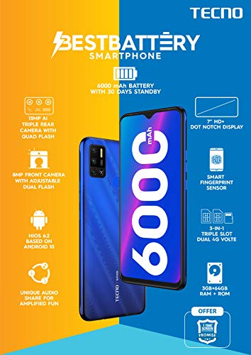 Spark 6 Air comes with impressive features, all designed to cater your needs. You get a big 7″ HD+ screen for watching videos, playing games and for online e-learning. Spark 6 Air also comes with a super powerful 6000mAh battery another segment first feature, which gives you upto 4 days of usage. You can also click beautiful pictures with 13MP AI triple rear camera 8MP AI selfie camera with unique dual front flash. That’s not all, with its unique Audio Share feature you can connect upto 3 audio devices and enjoy music and movies together. All these features make Spark 6 Air a perfect device for you.