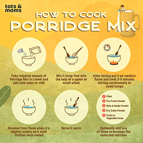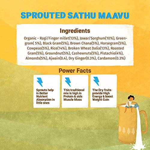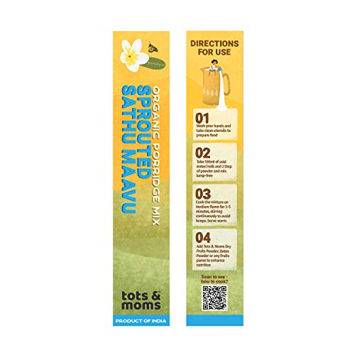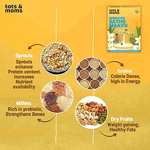 Complete Meal with the Goodness of Sprouts It is a healthy and nutritious sprouted powder which can be given to people of all age group. The sprouting process makes it easier for the body to absorb nutrients especially Iron, Zinc, and Vitamin C¹. Made using 19 different ingredients including 8 sprouts and 3 dry fruits. Helps toddlers attain Healthy Weight Gain. Adults and Pregnant women can use it as a Health Drink TOTS AND MOMS’ Sprouted Health Mix is – A rich source of energy, helps in weight gain and easy digestion A immunity booster to fight against frequent illness A rich source of proteins & calcium help in healthy growth, development and learning in kids. 100% Organic Preservative, additive and milk solids free with healthy ingredients Ingredients: Rice, Wheat, Ragi, Jowar, Roasted Gram, Green Gram, Black Gram, Corn, Groundnuts, Sago, Chickpeas, Horse Gram, Cow Peas, Omam, Dry Ginger, Elaichi, Cashew, Pista, Badam Nutritional Values and Health Benefits – High in iron Rich Calcium content Rich source of Protein High in Vitamin C¹ Directions to Use: Take 1 tbsp of powder in a bowl and mix without lumps in 100 ml of cold water/milk. Cook for 5 mins in low flame, add any flavors or sweeteners & serve lukewarm. Older kids can be added to porridge, kheer, sweets to increase the nutritional value. Product Description