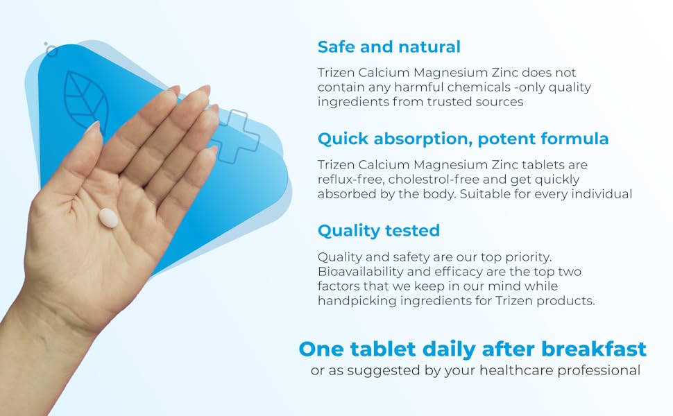 Take 2 Tablets of Trizen Calcium Magnesium Zinc Vitamin D3 after any meal during the day. EASY TO SWALLOW and NO AFTER TASTE.