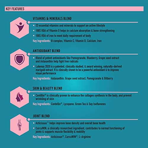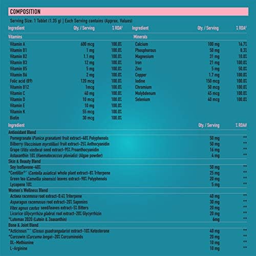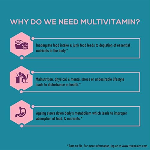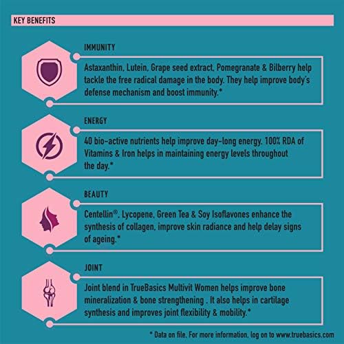 Anti-oxidant blend: Truebasics Multivitamin for Women Potent anti-oxidants like Astaxanthin, Grape seed extract, Pomegranate & Bilberry help tackle the free radical damage in the body and boost immunity.