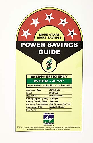 Energy Rating: 5 Star. Best in class efficiency. Annual Energy Consumption: 892.32 units. ISEER Value: 4.51 (Please refer energy label on product page or contact brand for more details)