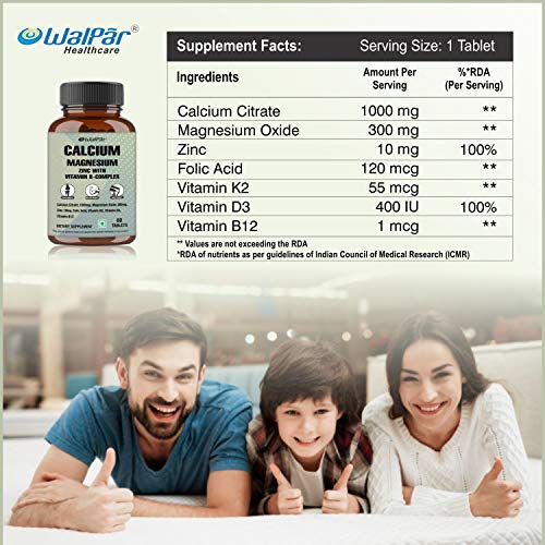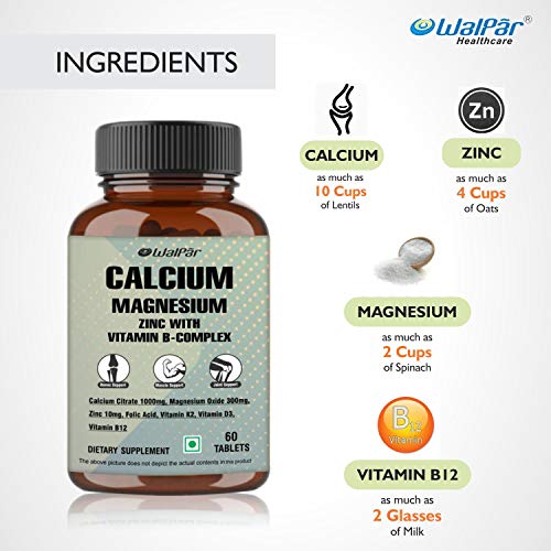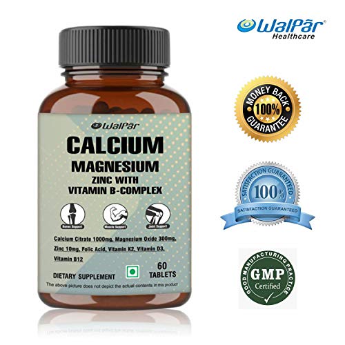 Faster Absorption of Calcium: Walpar’s Calcium Magnesium & Zinc Tablets is one of the best Calcium glucosomine Supplement as Calcium along with Folic Acid, Vitamin D3, K2, B12, Magnesium and Zinc helps in faster absorption of Calcium Not Just Plain Calcium Tablets: Walpar’s Calcium pure alfalfa teblet are a unique combination of 1000 calcium, magnesium, zinc & vitamin D3 which increases the bioavailability of calcium and makes it a complete solution Superior form of calcium: Calcium Citrate is a more bioavailable form of Calcium than Calcium Carbonate. Some Other calcium salts can cause calcium deposits but Calcium citrate absorbs very easily in the body Easy on stomach: Walpar’s Calcium Tablets is easily digested and does not cause bloating Supplement for both Men & Women: Each serving of Calcium Tablets for Men & Women provides 1000mg Calcium, 300mg of Magnesium, 10mg Zinc, 120 mcg Folic Acid, 55 mcg Vitamin K2, Vitamin B12 1mcg along with 400 IU Vitamin D3 for kids batter then calcium lactate powder vitamin c tablet effervescent